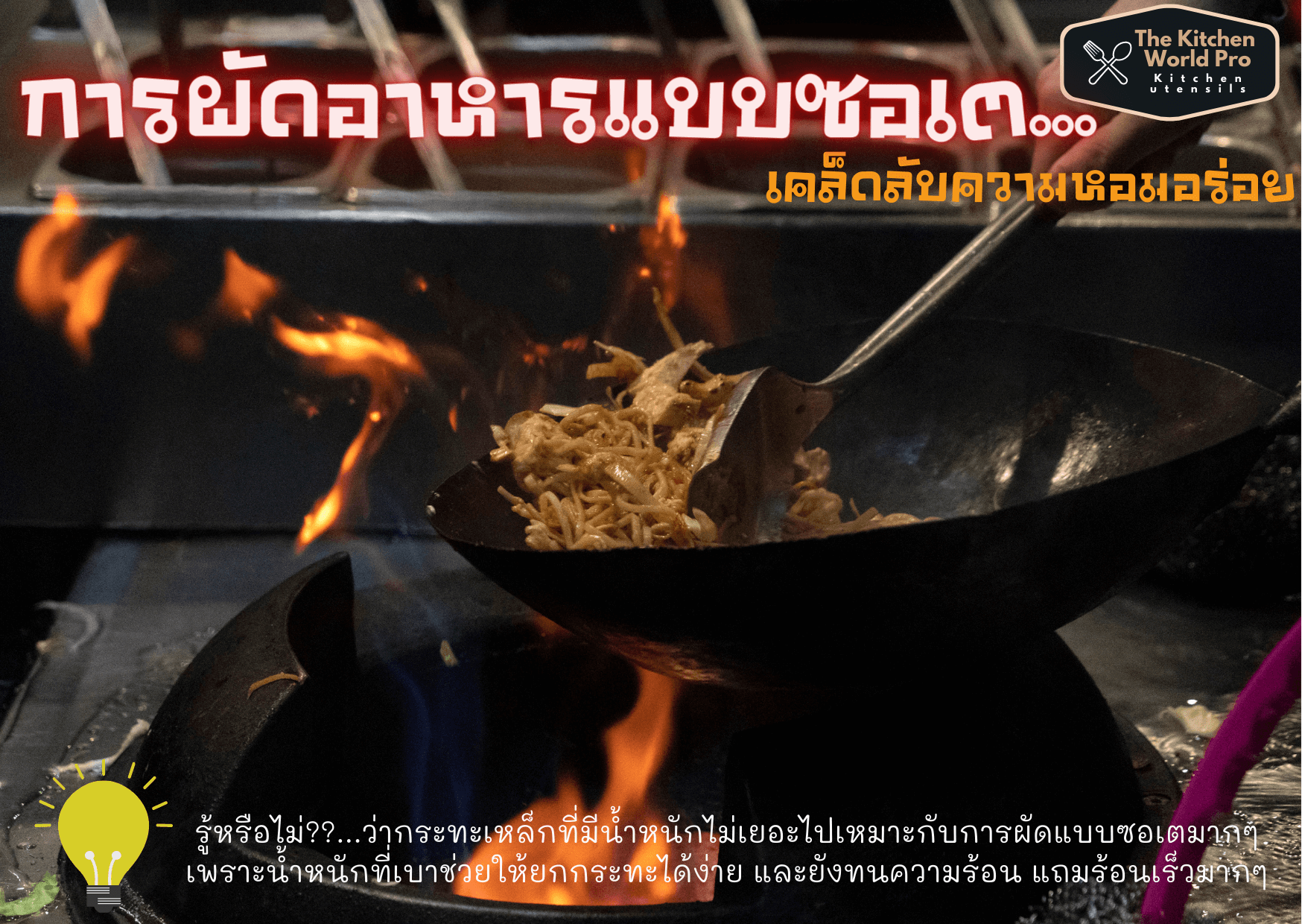 การเลือกใช้กระทะในการผัดแบบซอเต แนะนำให้ใช้กระทะเหล็กที่มีความหนาไม่ต้องเยอะมาก